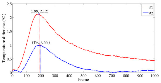 A number of sampling areas were taken at the defect area and the non-defect area to eliminate the influence of thermal excitation unevenness, as shown in Figure 25. The average temperature of different areas and the temperature difference between the defect area and non-defect area was calculated respectively, and the course curves of the average temperature difference over time were drawn, as shown in Figure 26. According to the peak values of curves, Frame 188 and Frame 196 were captured for the extraction of defects #1 and #2, respectively.
