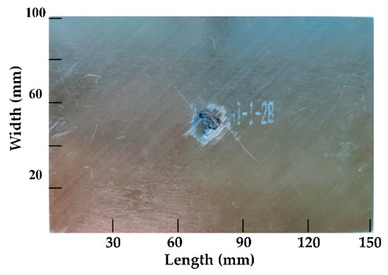 The size of the CFRP board is 150 mm × 100 mm × 3.89 mm. The test block is unidirectional lamination with the lamination direction [45/−45/0/−45/45/−45/45/90]. A falling weight impact test was adopted. The impact point was located at the center of the carbon fiber impact damage, and the impact energy was 72.19 J. The appearance of the impact damage is shown in Figure 28.