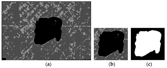 Delamination defect detected by UT and its extraction: (a) Delamination defect detected by UT; (b) ROI; (c) Defect segmentation.