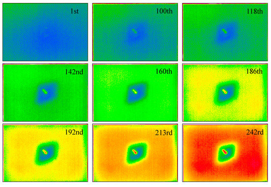 The specimen of CFRP was detected by long-pulse infrared thermal wave where the detection method was the transmission method. The relevant parameters were set as follows: the pulse excitation time was 5 s, the acquisition frequency was 30 Hz, and a total of 500 frames were collected. Some frames of the sequence are shown in Figure 30.