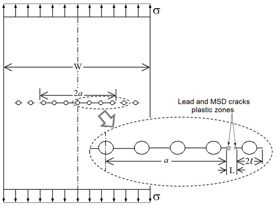 A variety of analytical and computational approaches can theoretically be used for estimating the residual strength of panels with MSD cracks. These approaches include analytical, semi-analytical (empirically corrected), computational and data-driven, and the accuracy of these approaches varies significantly [27]. Figure 1 illustrates the configuration of a typical panel having a lead crack along with adjacent MSD cracks, which is being considered here. Linear Elastic Fracture Mechanics (LEFM) is one of the most fundamental theories in fracture mechanics, and it can be used for evaluating residual strength for different types of crack configurations [43]. However, the LEFM is more applicable to brittle materials since it assumes a linear-elastic behavior for the material at the crack tip. According to LEFM, failure (or unstable crack extension) will occur when the value of the crack-tip SIF reaches a critical value. This limiting value of the SIF is called the fracture toughness (KC). The fracture toughness is a material property, but for thin sheets, it is also slightly dependent on thickness, grain orientation and crack length. For a panel with a major crack and collinear adjacent MSD cracks subjected to tension, as illustrated in Figure 1, the Mode-I stress intensity factor (KI) for the lead crack is: