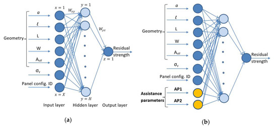 The purpose of the assisted approach proposed in this paper is to assist the ANN learning process; and therefore, improve the accuracy of the output predictions. This is done by including additional “dependent” input parameters that are obtained from the known analytical input/output relations. A schematic illustration of the structure of the implemented ANN model for the assisted-ANN approach is shown in Figure 2b. As in the traditional approach, the input layer includes geometry and material related inputs as well as the panel configuration identifier. In addition to these direct independent inputs, one or more assistance parameter input(s) is/are included. The assistance parameters being used here are mainly geometric corrections for the crack-tip SIF. In general, the choice of the assistance parameters for any type of problem depends on the specific knowledge of the existing relations between the inputs and outputs. For the MSD problem being considered here, from the previous investigations, it can be seen that the linkup model, though not accurate, can capture the general trend of the experimental data to some extent. Since the linkup model is basically based on SIFs (the SIF is used to calculate the plastic zone size, Equation (3), it becomes reasonable to assume that the SIF’s geometric correction factors can assist the ANN in the learning/prediction process. In order to demonstrate the effect of this assisted approach, four different levels of assistance are used. In each of the four levels, assistance parameter(s) that provide progressively higher level of assistance are used. Table 1 lists the different input assistance parameters that are used at each of the four levels. The details of the four assistance levels are as follows: