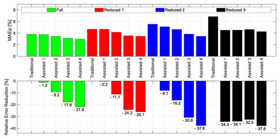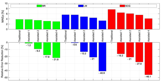 To further illustrate the accuracy improvement resulting from using the assisted approach, Figure 3 is developed using the MAEP values given in Table 2. From the figure, it can be seen that for any of the five scenarios, the BR gives the best accuracy followed by the LM then the SGC. The figure also shows that, for all three learning algorithms, the accuracy gradually improves as the assistance level increases (from assisted 1 to assisted 4). This gradual accuracy improvement is consistent with the logic of assigning the assistance parameters being used at the different assistance levels, where at each level, a higher-order assistance parameter is used (as previously explained in Section 4.2). In order to quantify the accuracy improvement obtained using the four assistance levels, the error (MAEP) reduction relative to the traditional approach is calculated and shown in the bottom part of Figure 3.