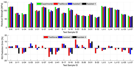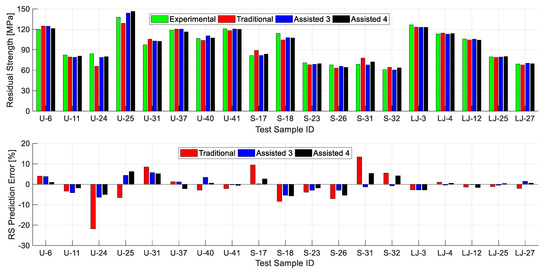 The experimental residual strength values along with the predictions obtained by the ANN model built using the reduced size training dataset (reduced 3) for the traditional and assisted approaches (assisted 3 and 4 only) for one of the testing datasets (top), together with the residual strength prediction errors (bottom). The shown ANN predictions are for the same testing dataset used in Figure 4.