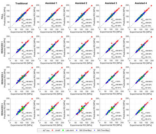 Effect of the assisted modeling approach and training dataset size on the correlation of ANN predictions with experimental residual strength values (for all data points used for training, validation, and testing). The effect of the assisted approach is observed when moving from left to right, while the effect of training dataset size reduction is observed when moving from top to bottom. The shown ANN predictions are for one of the 80 training/validation/testing datasets random combinations.
