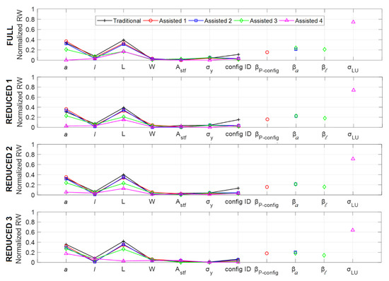 To better understand how the proposed assisted-ANN modeling approach improves the prediction accuracy and enables the network to be trained efficiently using small datasets, it is essential to look at the effect of the added assistance inputs on the internal parameters (i.e., the weights) of the ANN. Specifically, the contribution of each input in the ANN’s residual strength predictions can be quantified by resorting to the connection weights (CW) algorithm [64]. The relative weight of any of the ANN inputs basically reflects its relative importance, and therefore the different inputs can be ranked based on the relative weight values [65]. That is, the evolution of the ANN internal parameters considering the different scenarios investigated in this work is embedded in the quantification of the relative weight values. The CW algorithm [64] uses the ultimate inputs-hidden connection weights (), from -th input node () to -th hidden node (), and the ultimate hidden-output connection weights (), from -th hidden node () to the -th output node (), obtained for the optimum ANN models of the different scenarios to assess the Relative Weight () of each -th ANN input () as follows: