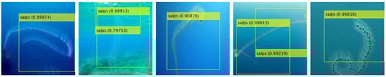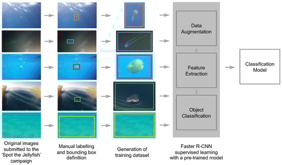 Data augmentation was also applied to increase the number of training examples. Deep learning techniques such as the Faster R-CNN method often rely on big data. However, in this case, only a few examples were available. In such circumstances, the model might learn the function very well by overfitting. Although very accurate results will be noted during the training process, the performance on unseen images will not be equivalent. In this study, as only 602 training images were available, overfitting was avoided through augmentation. As discussed by Shorten and Khoshgoftaar [27], such a process will help to create synthetic instances to increase the size of the training set. In this case, the jellyfish images were vertically and horizontally flipped and in each case, a different feature layer was defined. For the majority of cases, the number of anchors was set to three. However, in classification Model 5, this was increased to ten. The test images were not part of the training set. As required by the models, these were resized to pixels. When more than one jellyfish was detected within the submitted image, the one with the highest percentage probability was considered. The adopted framework for the training of each classifier is graphically represented in Figure 3.