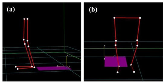 - The lower limb is schematically represented with three uniaxial and infinitely rigid elements (red in Figure 4);