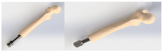 The CAD model of the bone was created using DICOM images from a CT-scan of a human femur. Subsequently, the main steps of the surgical implantation of the prosthesis have been virtually reproduced by means of SolidWorks. Final CAD models of the implant/bone assemblies of both prostheses are shown in Figure 6.