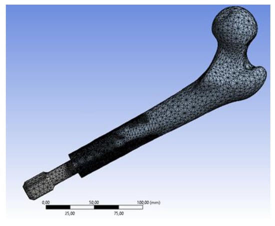 Considering that, nowadays, numerical methods ensure very accurate and reliable results and are commonly used to evaluate the behaviour of orthopaedic implants [41,42,43,44,45], numerical simulations have been performed on both models to investigate how stress distributions vary during a fall. In particular, a FEM-based approach has been used and virtual simulations [24,46] have been performed using the commercial software Ansys Workbench (Ansys Inc., Canonsburg, PA, USA). To obtain highly reliable numerical models, the FEM models have been set up following a largely validated protocol [30,47,48]. Ten-node tetrahedral elements (SOLID187) were used to mesh the femur and the implant, and eight-node surface-to-surface (CONTA174 and TARGE170) contact elements [30] were used to mesh the bone/prosthesis interfaces (Figure 7).