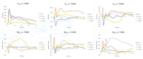 Forces and moments on the abutment have been calculated as described previously in Section 2.1. A limited time of 400 ms after the impact has been considered. The peak values of forces and moments, in fact, always occurred in this time for all analysed fall scenarios. Figure 8 shows the plots of forces/moments vs. time. The calculated loads have been used as boundary conditions for the FEM analyses.