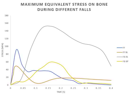 OPL prosthesis: Plots of the maximum values of the equivalent stress on the bone during different fall scenarios: Fall Forward (FF), Fall Forward with Balance Loss (FF BL), Fall Backwards with Balance Loss (FB BL), Fall Backwards “By Push” (FB BP).