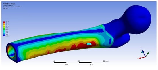 According to previous studies [52,53], a bonded contact was imposed at the intramedullary stem/bone interface to simulate a total osseointegration. As for the contact algorithm, the augmented Lagrangian method was used [54]. As regards the boundary conditions, a fixed support constraint was applied to the proximal femur; the forces and the moments, calculated as described in previous Section 2.1, were applied on the end of the abutment.