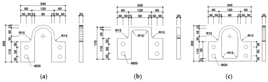 As shown in Figure 1, all the steel dampers were divided into energy dissipation members and shear plates that transferred external shear force. The size of each shear plate was 75 mm × 110 mm and the thickness was 20 mm. The shear plates were located on each side, and the distance between them was 90 mm. The steel dampers were designed in opened U- and angled U-shapes and a closed D-shape according to the shape of the energy dissipation parts. The thickness of all dampers was 20 mm, and the width of the member for energy dissipation was planned to be 15 mm. The spacing between the shear plates, the thickness of the dampers, and the width and height of the energy dissipation members were designed in consideration of the strength and deformation capacities of the specimens. The corners of the steel dampers were rounded to prevent stress concentration.