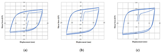 The shear force versus displacement relationships of the specimens are shown in Figure 4, and the experimental results for the first yielding and maximum load of the specimens are shown in Table 2. As shown in Figure 4, the stiffness of all specimens decreased significantly after first yielding, and gradually increased until the target displacement. For all specimens during the repeated load cycles, the peak load slightly increased or almost remained steady, and no decrease in structural performance of the specimens was found. The experiment of Specimen SD1 was terminated after performing only 2.5 repetitions due to an error with the test equipment, but it showed sufficient behavioral characteristics to allow for a comparison with the hysteresis behavior of the Specimens SD2 and SD3.