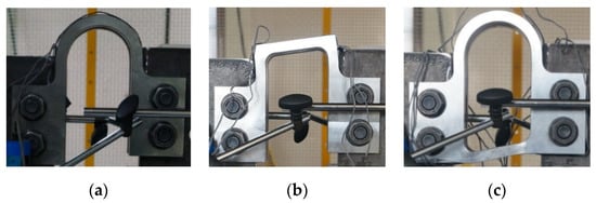 As shown in Figure 2, four identical dampers were installed on each specimen to prevent eccentric deformation of the damper device and to distribute the force acting on the bolt fastened to the shear plates. The dampers were connected to the tops and bottoms of the fronts and rears of T-shaped loading plates, which were connected to L-shaped steel loading frames. As shown in Figure 2, two L-shaped loading frames were used in this experiment: one fastened to the bottom steel frame and the other to a loading actuator of a universal testing machine (UTM) with a capacity of 2000 kN. When a load was applied to the top of the L-shaped loading frame, the loading frame moved vertically, and the shear force was transmitted to the dampers via loading plates.