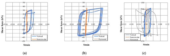 Similar to SD1, SD3 did not yield in the semicircular connecting member. On the other hand, both the vertical and the lower horizontal members reached yield strain in first cycle. The first yielding was observed at 36.2 kN in the lower horizontal member, and then at 55.5 kN in the vertical member. The vertical member of SD3 showed a maximum strain of about 0.027, showing similar strain characteristics to SD1. It can be seen from Figure 6 that the lower horizontal member, which is unique to SD3, exhibited a maximum strain of about 0.066, and both the vertical and the lower horizontal members greatly contributed to energy dissipation. It is noted that the maximum strain range of the damper can be controlled by planning the geometric dimensions of the energy dissipation members of the damper.