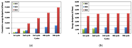 Figure 7 shows the energy dissipation of the specimens for each cycle. In this study, the energy dissipation was the inner area of the load–displacement relationship curve. In the first cycle, since the elastic and plastic phases existed together, the value was slightly lower than those of the other cycles. The cumulative energy dissipation of Specimens SD2 and SD3 showed almost proportional increase, as shown in Figure 7a.