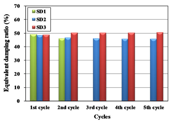 Figure 9 shows the equivalent damping ratios of the specimens for each cycle. As shown in the figure, both open and closed specimens showed high equivalent damping ratios. That is, the equivalent damping ratios of from 48.7% to 50.4% for SD1 and SD2 and from 45.7% to 49.1% for SD3 were experimentally evaluated. SD1 showed an equivalent damping ratio of 49.1% in the first cycle. The second cycle showed an equivalent damping ratio of 45.9%, which was 3.2%p lower than the ratio obtained in the first cycle. For SD2, the equivalent damping ratios of the first and second cycles were 48.2% and 46.5%, respectively, showing a difference of 1.7%p, a similar result to that obtained from SD1. SD2 showed an equivalent damping ratio of 45.7% in the fifth cycle, which was 2.5%p lower than the ratio obtained in the first cycle. SD3 showed an equivalent damping ratio of 48.7% in the first cycle and then showed a higher equivalent damping ratio of about 1.5%p in the second cycle, which it maintained until the final cycle. From the experimental results, the excellent damping capacity of the proposed damper SD3 was confirmed.
