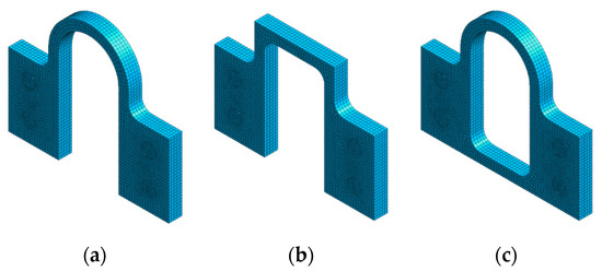 FE modeling of steel dampers used in this study: (a) SD1; (b) SD2; (c) SD3.