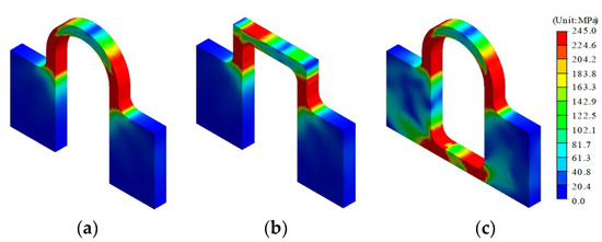 Stress distribution of steel dampers obtained from FE analysis: (a) SD1; (b) SD2; (c) SD3.