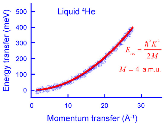 This equation refers to the center of the measured peak. Hence, INS from a gaseous sample of atoms leads to an intensity peak centered at energy transfer , and having a finite width being caused by the additional term . This term represents the so-called Doppler broadening (see also Appendix A). Peak center and peak width are illustrated in Figure 1, which shows data of incoherent neutron scattering from liquid helium, He; for details see [25].