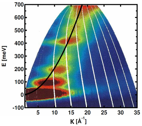 Experimental intensity map of ice Ih at 20 K and 1 bar, recorded on MARI [16]. meV. The shown black line (parabola) is the conventional recoil trajectory of a free H. The strong intensity ribbon at is mainly due to the aluminum cell containing the water (ice). The intensity peak centered at meV and Å represents the vibrational stretching OH-vibrations. See the discussion in the text. (Reproduced from reference [17] with permission.)