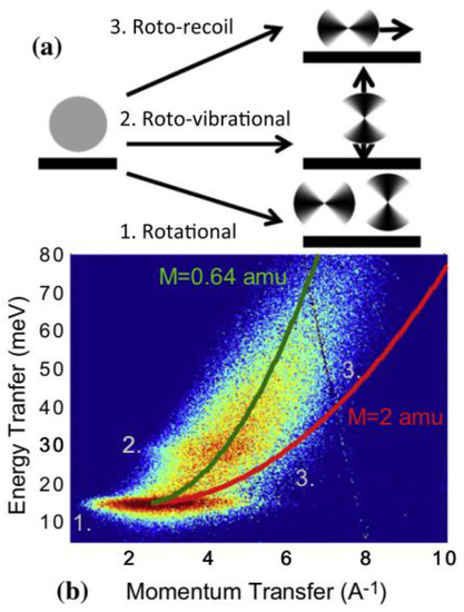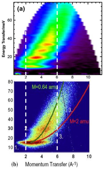 The measured two-dimensional INS intensity map of H is presented in Figure 3, which is reproduced from the original publication of Olsen et al. [28]. The following features should be observed.The intensive peak centered at meV is due to the first rotational excitation of the H molecule [11]. Furthermore, the corresponding momentum transfer of this intensity peak is Å. Hence, the peak position in the plane fulfills the relation with the mass of the free H atom,