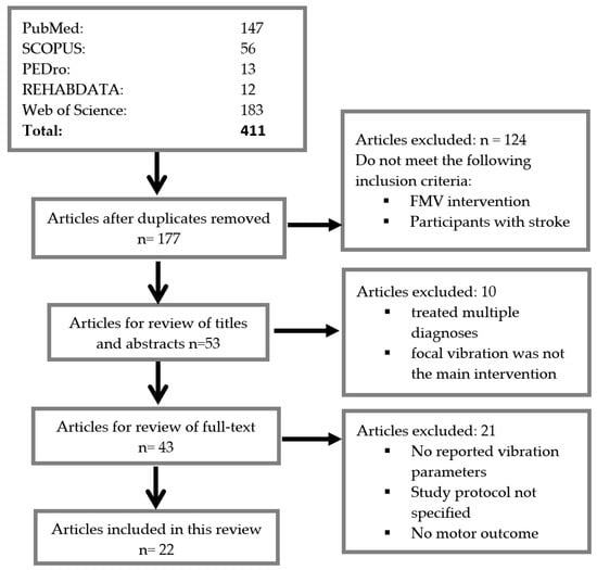 The review process is shown in Figure 1. The search yielded 411 (PubMed 147 articles, SCOPUS 56 articles, PEDro 13 articles, REHABDATA 12 articles, and Web of Science 183 articles) results. After removing duplicates, 177 articles were reviewed. Of these articles, about 53 were selected for review of titles and abstracts based on relevance, language, and intervention. Ten out of the 53 papers were excluded based on relevance and patient diagnoses. The remaining 43 papers were selected for the full text review. This list was then narrowed down to a final list of 22 papers.