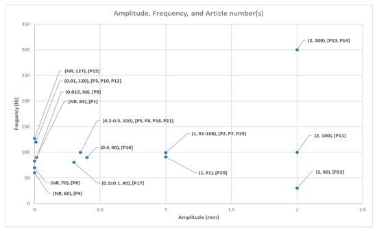 The frequencies and the amplitudes used in the included studies are represented graphically in Figure 2. The most frequently used combination was 100 Hz and 0.2–0.5 mm [,,,], followed by 120 Hz and 0.01 mm [,,] and 99.5 Hz and 1 mm [,,]. The FMV frequency ranged from 30 Hz to 300 Hz and the amplitude ranged from 0.01 mm to 2 mm.