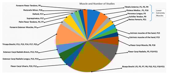 In terms of the muscles where the vibration was applied, 20 different muscles were targeted, with five muscles for lower extremities and 15 muscles for upper extremities (Figure 3). Biceps brachii was targeted the most, followed by triceps brachii and flexor carpi radialis.