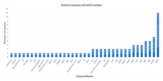 Thirty-seven different outcome measures were used across the 22 studies. The most common outcome measure was assessment of the spasticity via the modified Ashworth scale, which was used in 11 studies, followed by grip strength assessed in five studies, and Fugl-Meyer scale and box and block test evaluated in four studies each. Figure 4 shows all outcome measures and how commonly they were used across studies.