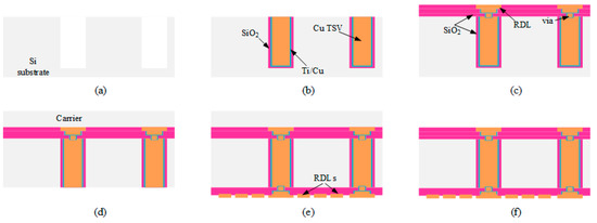 Schematic of the major fabrication steps:(a) via formation, (b) via filling, (c) RDLs and vias formation, (d) Temporary bonding and backside grinding, (e) inductor formation, (f) TSV module assemble.
