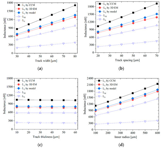 Impact of (a) track width, (b) track spacing, (c) track thickness and (d) inner radius on the total inductance.