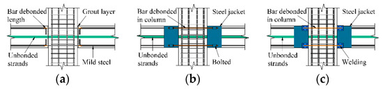 - Yan, Q.; Chen, T.; Xie, Z. Seismic experimental study on a precast concrete beam-column connection with grout sleeves. Eng. Struct. 2018, 155, 330–344. [Google Scholar] [CrossRef]