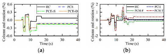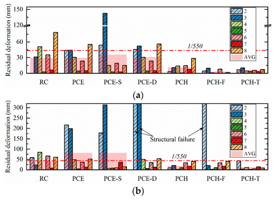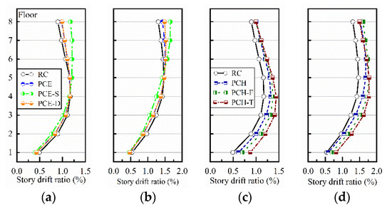 - The post-earthquake residual deformation of the non-emulated frames is small, but the ductility demands for the joints are higher. Therefore, more attention should be paid to the brittle fracture and fatigue failure of energy dissipation rebars caused by the large deformation for this type of connection. When energy dissipation rebars are not installed, this type of frame overly relies on the damage of structural columns to dissipate seismic energy, which will also cause the structure to be irreparable after the earthquake. Therefore, the structural system containing only prestressed tendons is not recommended in high-intensity areas.