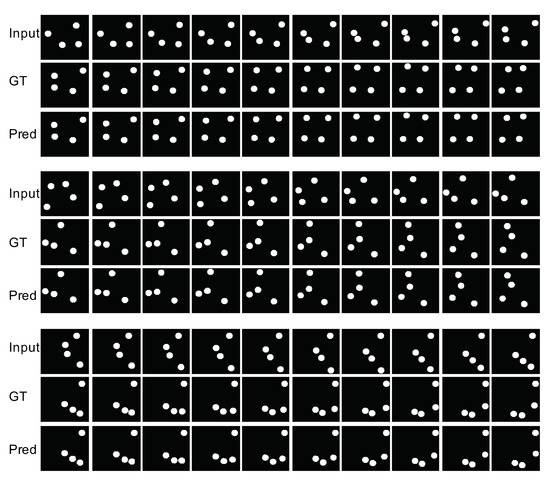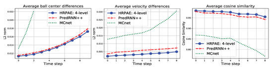 Following the experimental settings in [23,40], the normalized velocity, defined as , of the balls, and the differences in norm between the ground-truth and the extracted ball velocities are shown in Figure 3b. The cosine similarity between the ground truth and predicted velocities is presented in Figure 3c. We observe that HRPAE outperforms PredRNN++ method with the smaller model size, e.g., the average cosine similarity of our method is , while that of PredRNN++ is . The results indicate that HRPAE excels at capturing high-level dynamics of physical states associated with the motion of the balls in a complex interactive environment.