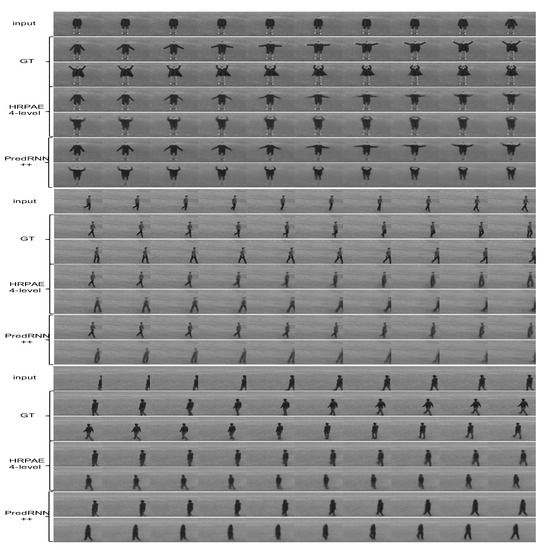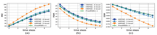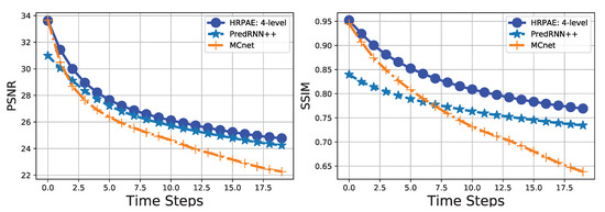 Implementation. Following the settings in [23,40], we generated 10,000 training and 1000 testing sequences with frame size where each sequence has 30 frames. The batch size is set to 8, and the default HRPAE (as shown in Figure 1) is trained for iterations (about 80 epochs) by randomly sampling 20 frames. The rate of Scheduled Sampling is gradually increased to 1 during the first 50,000 iterations. We trained PredRNN++ under the same experimental settings, whereas the first layer of PredRNN++ is expanded to 64 channels; as compared to MMNIST, we doubled the patch size in order to maintain the width and height of input frames, because the frame height and width are 128 pixels.