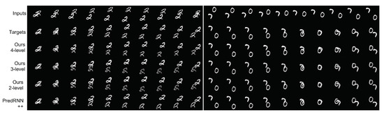 In Figure 5, we present examples of the predicted testing frames for the discussion of qualitative results. As shown in the figure, even though the digits get entangled with each other, our model is able to make accurate predictions. For example, in the left-side example of Figure 5, the two digits of “2” are overlapped with each other in the beginning of the target future sequence. Our model is able to maintain the shape of digits and make accurate predictions of the locations. This proves our models because even a small one, e.g., 2-level HRPAE, is able to preserve the distance information between digits. Similar observations can be made for the right-side example.
