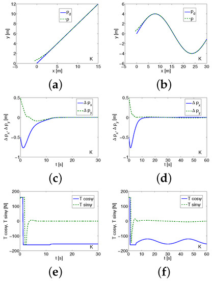 Comment. The controller has been used originally for an underactuated hovercraft which is equipped with the rudder. In this work, the algorithm serves as a tester for obtaining information about the dynamics of the vehicle and to show that under the assumed conditions the trajectory tracking task can be realized correctly. The angle changes are not taken into consideration if the vehicle moves. The information from the test includes the applied forces in both directions, the body velocities, and the errors convergence. The vector function contains elements of the dynamic model of the vehicle. As it can be seen from (10) and (11), not only the position and velocity errors depend on the gains but also on other terms. For this reason the end values of the errors may be not equal to zero. In spite of that the error convergence should be guaranteed.
