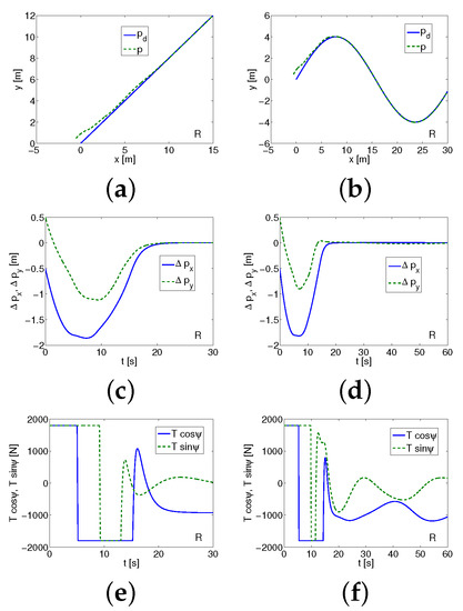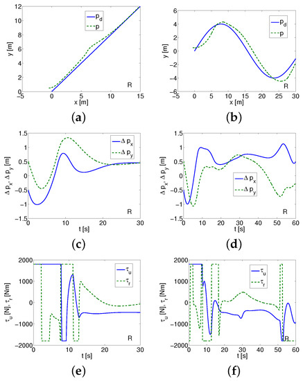 As shown in Figure 6a,c for Kambara, the control task is not realized because of great position errors and velocities oscillations. Moreover, because of the force and the torque changes (Figure 6e), the vehicle would be destroyed.