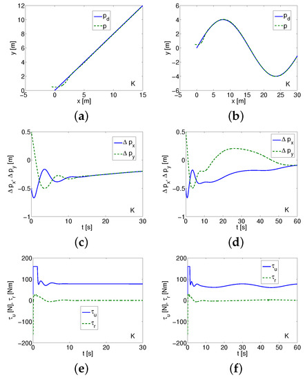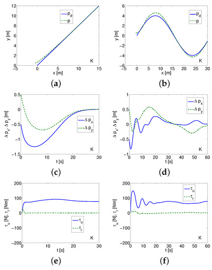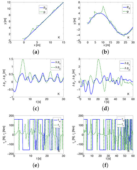 Comment. The controller may seem similar to SMC, but this similarity is apparent because of the completely different concept of the sliding surfaces. Some difficulties may concern the choice of parameters , , , . Despite this, the selection of gains , , , and seems more obvious. It can also be expected that the correct setting of parameters and improves the quality of the tracking control. The algorithm was verified via simulation on a model of an underwater vehicle using linear and circular desired trajectories. In [18], the performance of the control method was tested. The problem of robustness to bounded disturbances defined by various functions was considered too. Based on satisfactory numerical results delivered in the original paper, it was decided to test this control algorithm.