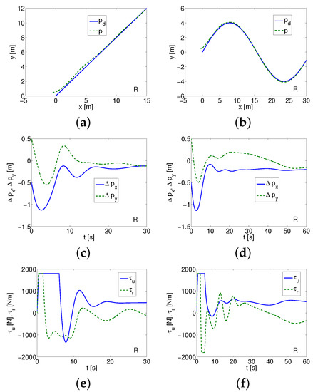 Simulation results obtained for FTSMC, linear trajectory and Kambara vehicle show that the position errors only go to a limited value other than zero (Figure 10). At the same time, the applied force and torque have acceptable values which indicate that the algorithm is working properly. Similar results were obtained for the sine desired trajectory as it is given in Figure 10. For ROPOS, the tracking errors tend to zero for both linear and sine trajectories at acceptable values of other tested variables (Figure 11). Satisfactory results can also be obtained for sine trajectory as shown also in Figure 11.