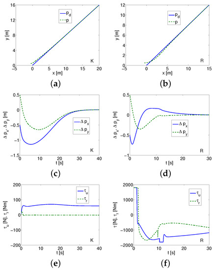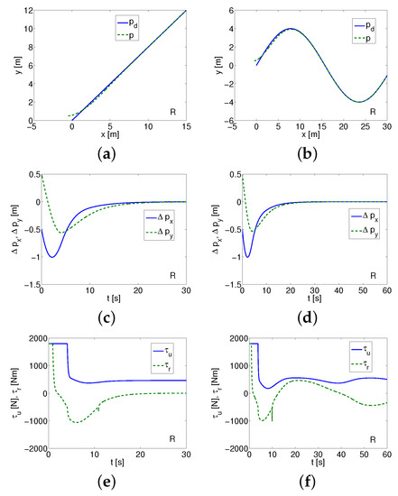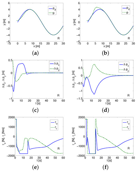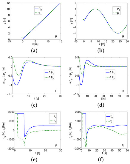 where , are the surge force and the yaw torque, respectively. Moreover, mean the vehicle velocities, and the vehicle position in the inertial frame. The other symbols denote , , and (the mass and the appropriate added mass). In Equations (4)–(6), are linear velocities, r is angular velocity, m is the mass, J is the inertia, , , , are the drag coefficients (with sign + [11] or − [17,18]). The quadratic drags are omitted to enable the comparison of algorithms under the same conditions. The disturbances are not taken into account because of the assumption that it is an the preliminary investigation of algorithms. The equations of motion are assumed in the form which enables comparison of the selected controllers. However, in the second part of this work, the disturbances are taken into account but only for control schemes which gave acceptable results in the first part of the test.
