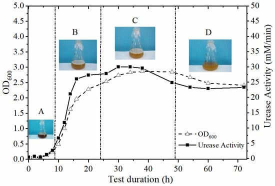 The urease positive microorganism used was Sporosarcina pasteurii (strain ATCC 11859), purchased from the American Type Culture Collection. A liquid medium, which contained yeast extract of 20 g/L, ammonium sulfate of 10 g/L, and Tris reagent of 17.5 g/L, was used to cultivate bacteria. Individual ingredients of the recipe were separately dissolved in distilled water bottles and autoclaved separately by autoclaving for 20 min at temperature of 121 °C and then combined post-sterilization. All operations were carried out under aseptic condition after sterilization of liquid medium. Suspended bacterial cultures were cultured in a shaker at a temperature of 30 °C and a rotational speed of 220 rpm until the stable period (Figure 1C) of the bacterial growth characteristic curve. The microorganism growth characteristic curve is shown in Figure 1. The OD600 value (the optical density of the sample at a wavelength of 600 nm) and urease activity of the bacterial suspension were measured following the methods utilized by Harkes et al. []. The OD600 value was regarded at the bacterial concentration in this study. Other desired OD600 value was obtained by dilution with sterile sodium chloride solution (9 g/L NaCl). The relative urease activity was determined from the change in conductivity of the media due to the generation of ammonia and carbonate ions [].