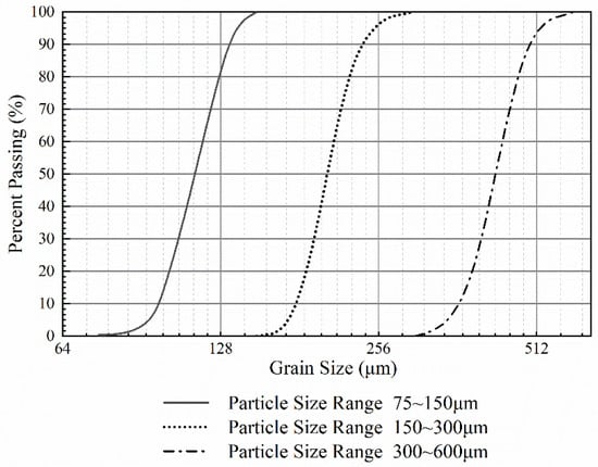 In order to make the best of MICP technology in engineering practice, the most effective treatment method and process optimization are critical to guide the use of MICP technology under different geological conditions. Soon et al. [] explored the viability of the MICP technique for improving the engineering properties of a typical tropical residual soil, and the effectiveness of MICP was evaluated by optimizing the treatment conditions. Rebata-landa [] reported that the ideal size range was 50–400 μm for bio-treatment. Li and Tian [] solidified the desert aeolian sand, primarily composed of sand grains with diameters of 100–250 μm, the feasibility and effectiveness of use of this process was then evaluated based on the density, permeability, calcium carbonate content, unconfined compressive strength, and microstructure of the treated sand. Malcolm [] investigated that the biomineralization tests were manipulated on potentially liquefiable saturated riparian soil (The particle size range of 91–210 μm) in the laboratory and field. The biomineralized soils showed properties that indicate calcite precipitation increased their resistance to seismic-induced liquefaction. Peng [] conducted a series of test using ureolytic bacteria to reinforce the organic clay (The particle size range of 12–99 μm), with cementation reagent with different concentrations flowing to the soil under pressures. After treatment, the unconfined compression strength can increase by up to 370%, and the permeability coefficient can be reduced by about one order of magnitude. Mortensen et al. [] tested the bio-treated columns on a wide range of grain sizes comprised of sand, silty sand, and silt and concluded that the MICP treatment was equally robust for these soils. Additionally, the effect of particle size on the mechanical behavior of other building materials was also reported. Haddock et al. [] evaluated the impact of aggregate gradation on asphalt mixture performance. They used two mixture types having nominal maximum aggregate sizes (NMAS) of 9.5 mm and 19.0 mm to evaluate the sensitivity of asphalt mixture performance to gradation changes. The effect of particle-size distribution on the one-dimensional compressive behaviour of granular soil materials was investigated using the discrete-element method (DEM) by Minh et al. []. Pouranian et al. [] reported that an asphalt mixture’s aggregate skeleton, related to voids in the mineral aggregate (VMA), is another important factor that affects critical asphalt mixture properties such as durability, workability, permeability, rutting, and cracking resistance.