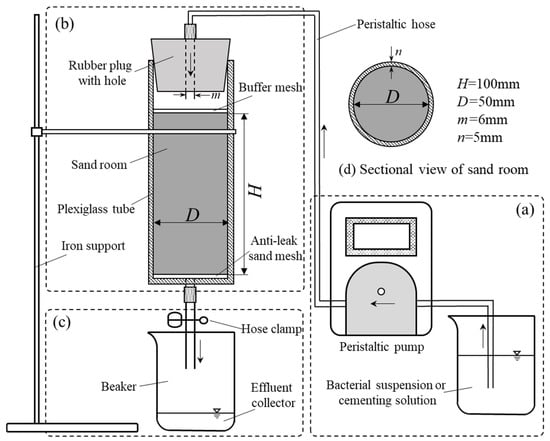 The schematic diagram of the experimental setup, intermittent injection in batches, is drawn in Figure 3. The apparatus consisted of power system, cementitious system, and drainage system. The purpose of the power system was to pump the bacterial suspension and the cementation reagent into the cementitious system, which was composed of a beaker, a peristaltic hose, a peristaltic pump, and a cementing system adapter. The liquid flow was directed from top to bottom by peristaltic pump. The cementitious system was the reaction chamber where the mineralization occurred. The sand columns had a height to diameter aspect ratio of 2:1. The interior of the plexiglass tube (wall thickness 6 mm) was used as a sand room with a diameter of 50 mm and a height of 100 mm. The buffer mesh was placed at the top of the column, and the anti-leak sand mesh was pressed at the bottom of the room to minimize possible loss of sand particles during liquid injection. The tube was positioned vertically with rubber plug upper surface, and a hose clamp was connected to the base. The drainage system was used to collect effluent.