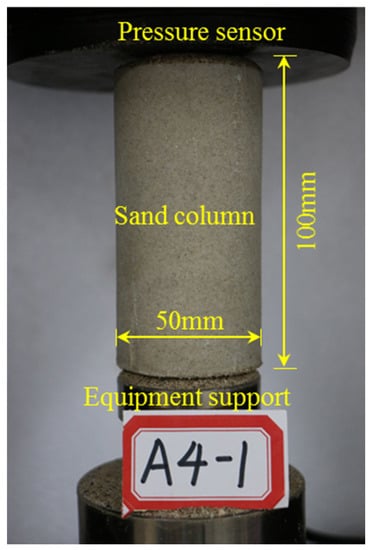 After completion of the bio-treatments, the specimen mold was dismantled carefully and the sand column was extruded from the mold. Then all the specimens were dried in a constant temperature oven for 48 h at 30 °C, and trimmed to a height of 100 mm and diameter of 50 mm for the unconfined compression strength (UCS) test in accordance with ASTM 2166 []. The displacement-loaded axial rate was carried out at a constant rate of 0.5 mm/min, as shown in Figure 4. The UCS values for bio-treated soil specimens were denoted as qu. Noted that a thin layer of sand was laid between the column and the equipment support to make a flat contact surface during this test.