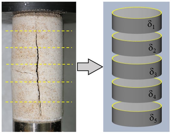 After completion of the geotechnical laboratory measurement, the calcium carbonate content was measure using an excess hydrochloric acid washing (1.5 M HCl) method []. For this purpose, the bio-treated subsamples were cut into 5 equal portions along the horizontal direction, as shown in Figure 5. Each part of the subsamples was crushed sufficiently and dried in an oven at a temperature of 105 °C, and then their masses were measured before and after the acid wash (1.5 M excessive hydrochloric acid solution for 24 h). Noted that the pH of the residual solution was verified using a test paper. The calcium carbonate content was the reduced mass of the solid particle washed with sufficient distilled water and dried at the same way because it would be dissolved in the acid solution. The percentage of calcium carbonate of subsamples was obtained by the following equation: