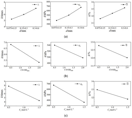 The variation pattern of kjm value of each test factor in Table 4 with level is shown in Figure 6. From Figure 6a, within the range of sand particle size, the kjm values of total infusion times λ, unconfined compressive strength qu and calcium carbonate content increased gradually with the increase of d, indicating that the increase of particle size was conducive to the improvement of solidified sand strength. With the continuous mineralization reaction, the pores between particles were filled with mineralized products, and the permeability coefficient of the sample tended to decrease gradually until the injected liquid was difficult to permeate inside the sample, which was regarded as the end of the mineralization test. As it is clear from Table 1, the compact bulk density of sand particles with particle sizes (75–150 μm, 150–300 μm, and 300–600 μm) are 1.451 g/cm3, 1.494 g/cm3, and 1.532 g/cm3, respectively. The initial void volume of sand column increased with the increase of particle size level, and the amount of calcium carbonate required for filling also aggrandized accordingly, thus increasing the required times of liquid injection. Therefore, the injection cycle times λ of sand with different particle sizes is related to the compact bulk density ρ of sand particles. The higher the initial compact bulk density, the more times of liquid injection are required, correspondingly the longer the mineralization reaction time, and the fuller the pores between sand particles are filled with calcium carbonate, which eventually leads to the rising unconfined compressive strength of bio-treated column samples.